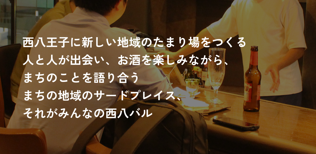 「~まちのサードプレイス~ みんなの西八バル」は、お酒を飲みながら八王子のまちのことを語り合える地域の“たまり場”を目指す交流拠点です。それぞれの立場でまちでご活動されているゲストやお客様同士、そして店員も加わって、みんなで地域や暮らしの話題を語らう中で、新たな出会いやつながりを生み出します。